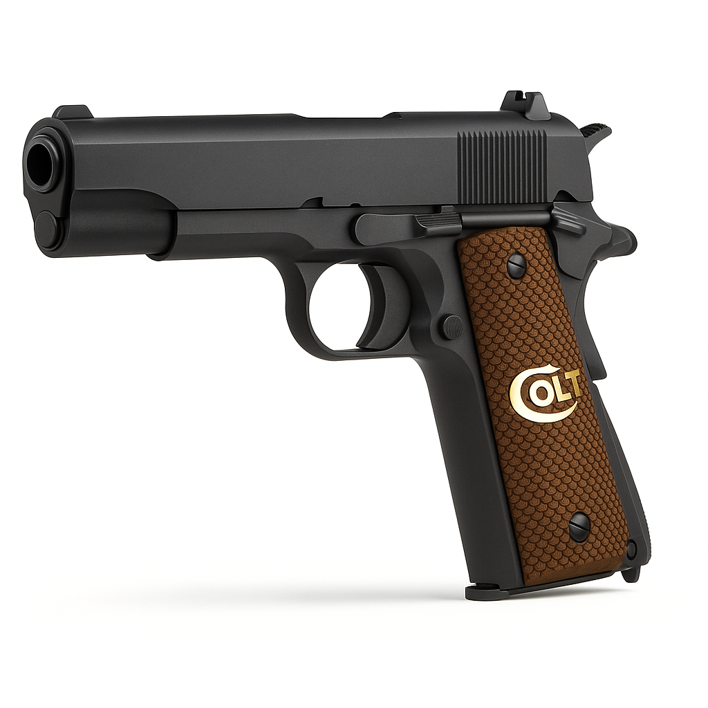 Premium walnut 1911 grips. Gold Colt logo inlay. Full fishscale texture enhances purchase. Satin oil finish resists moisture and solvents. Precision-drilled for easy installation. Suitable for range, carry, and display.